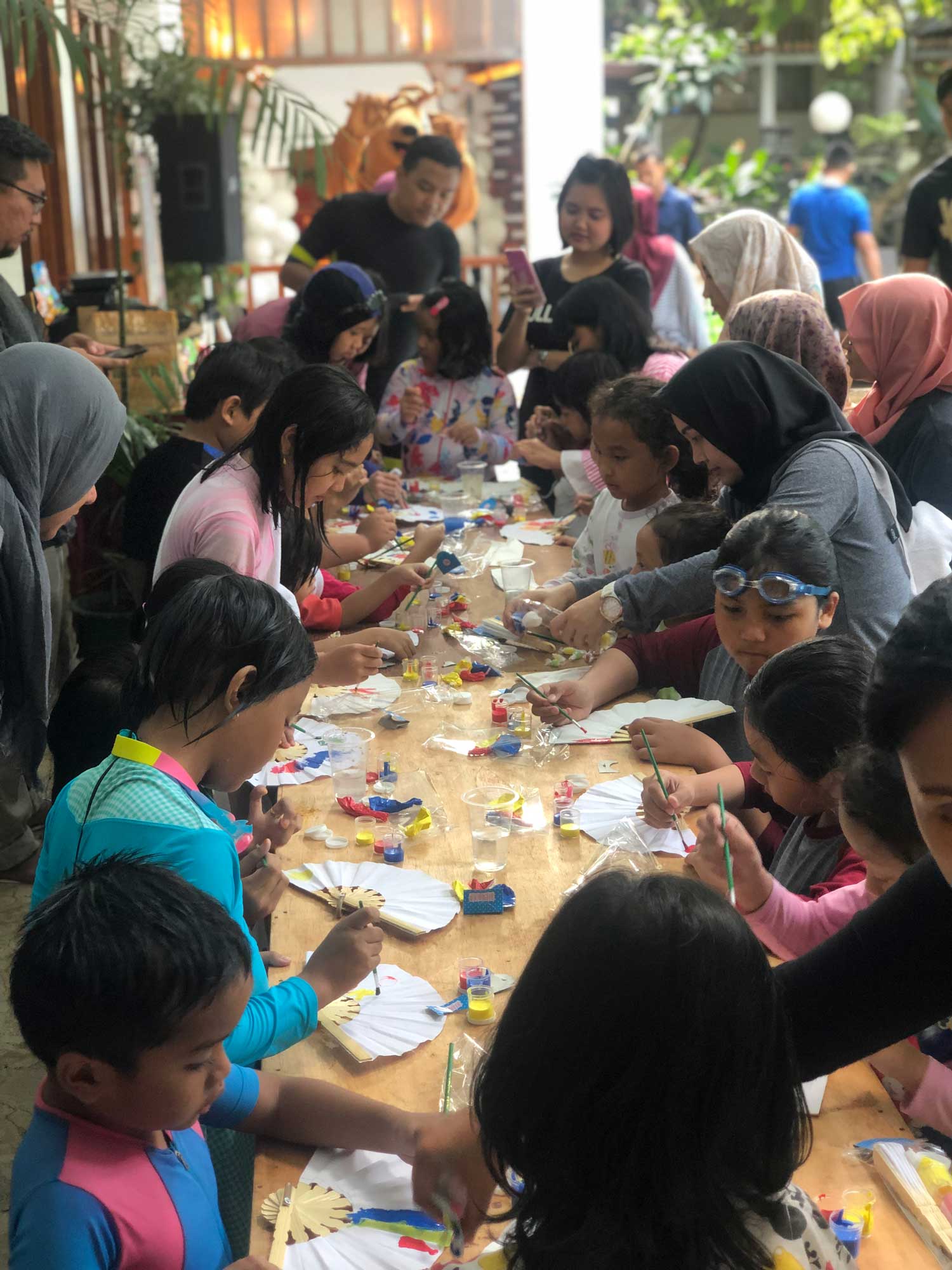 Another interesting activity is Wet Wet Party which becomes the typical activity most-awaited by kids at Hotel Salak The Heritage. In the swimming pool, they can play some exciting games and get prizes. In welcoming the New Year, they will have Wet Wet Wet Party on February 3, 2019 in the morning. It provides special art games of Fan Painting participated by more than 25 kids. They will be given 30 minutes to express their painting creativity on the fan with attractive colors to paint cherry trees, lanterns and the scenery. In the end, they can choose the prizes they like. Don’t miss to take a picture or selfie with Dirly (Deer Clown Hotel Salak The Heritage) which also enlivens the fan painting that morning .